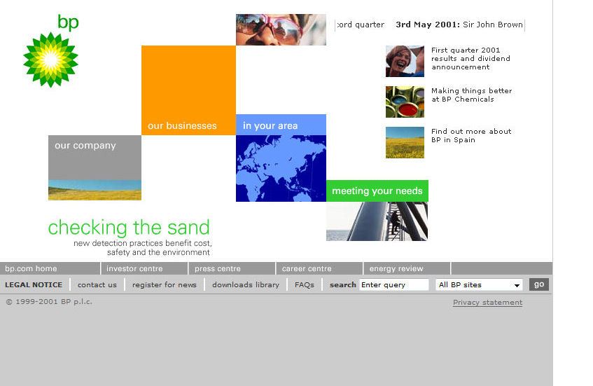 I was responsible for the home page of the 2000 relaunch of BP.com was almost certainly the first major corporate web presence to be built using a pure CSS non-table-based design.