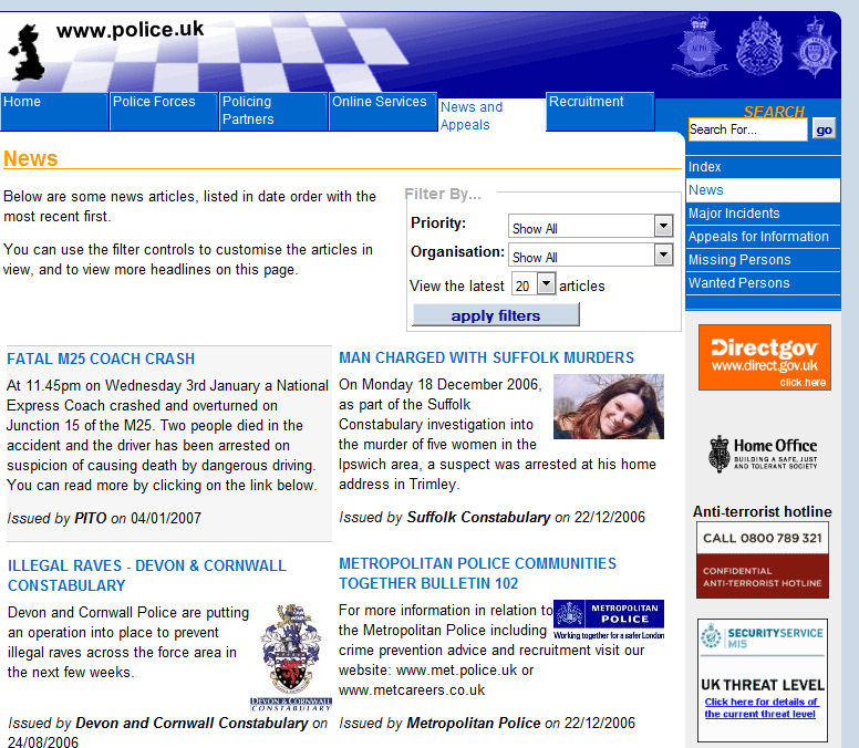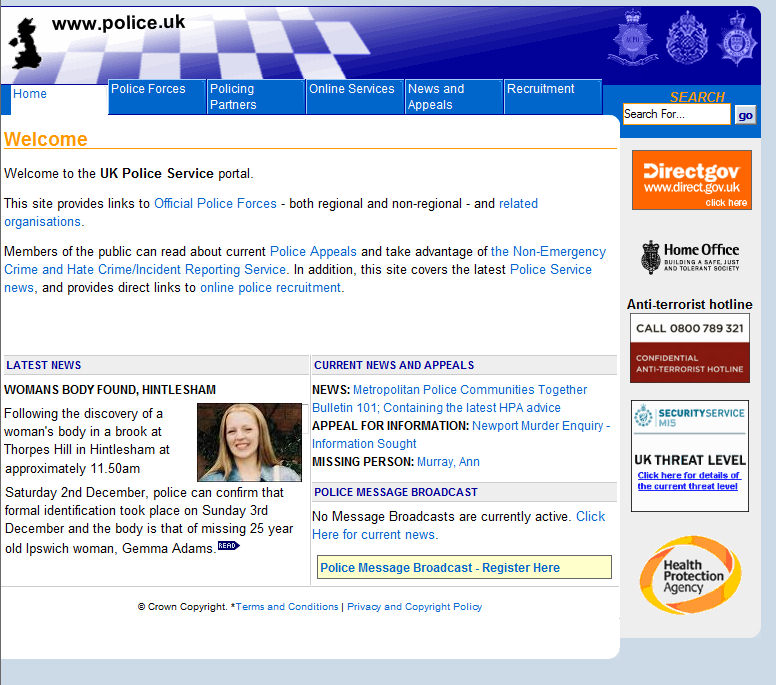 In addition to the UK National Police Portal, I oversaw the design and development of several other web presences for the NPIA and various individual forces, including the Metropolitan, West Midlands and Suffolk Constabulary.